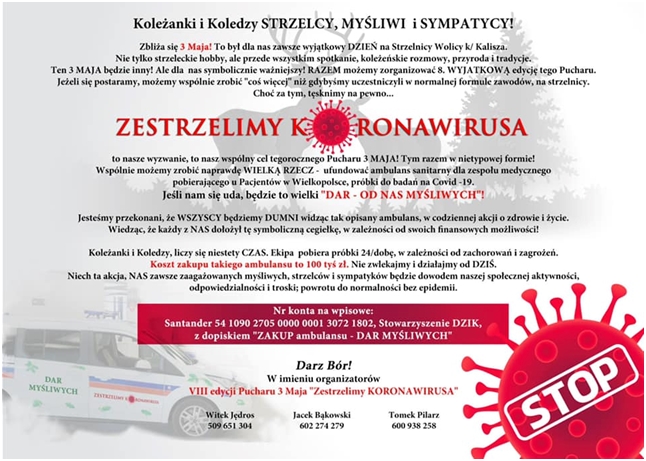 Planowane są także na dzień 3 maja zawody strzeleckie pod patronatem europosłanki Prawa i Sprawiedliwości Andżeliki Możdżanowskiej. Dziś trudno odpowiedzieć na pytanie czy w tym terminie będą mogły się one odbyć. Bez względu na to warto wpłacać pieniądze na zakup ambulansu. Bo warto pomagać.