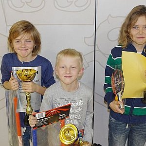 W grupie juniorów grali zarówno chłopcy jak i dziewczęta, aby dodać pikanterii tym zmaganiom. Tutaj bezkonkurencyjny był Wiktor Wiśniewski z NOK Nakło, który zawody te wygrał z dorobkiem 6,5 pkt / 7 możliwych. Kroku dotrzymywała mu klubowa koleżanka Magda Rydzyńska, która wygrała kategorię kobiet. W rywalizacji duetów rodzinnych ostro zagrali Alan i Olaf Jagodzińscy z Palmierowa, szkolący się na co dzień w Kcyni, którzy z dorobkiem 4,5 pkt. zajęli odpowiednio 2-3 miejsce w grupie chłopców. Tym samym zepchnęli oni poza podium braci Mikołaja i Jakuba Pyszka z Sadek (4-5 miejsce). Mikołaj jednak, zdobył puchar dla najlepszego mieszkańca gminy Sadki, który osłodził mu lekki niedosyt. Pierwsze szlify turniejowe otrzymał też siedmioletni Oskar Maćkowiak z Sadek, który rozpoczął swoją przygodę z szachami od września br. i otrzymał nagrodę dla najmłodszego uczestnika turnieju. W grupie dziewcząt drugi stopień pudła im. Hanki Mostowiak, zajęła trzecia w Wiśniewskich – Weronika, która wyprzedziła koleżankę z NOK Nakło Joannę Bruską. Dla Asi zdobyty puchar, był pierwszym w karierze, więc zachęta najwyższych lotów już poszła w eter. Siostry Bruskie przedzieliła Julia Guszka z Sadek (4 miejsce), która w kategorii ilości wypowiedzianych słów na minutę, z pewnością prześcignęłaby wszystkich uczestników tych zawodów. Nieznacznie jednak odstawałby od niej jedynie Andrzej Kuligowski. Swoją drogą, gdyby przyczepić tej dwójce jakiś agregat prądotwórczy do ust, to tania energia popłynęła by strumieniami do setek domostw.