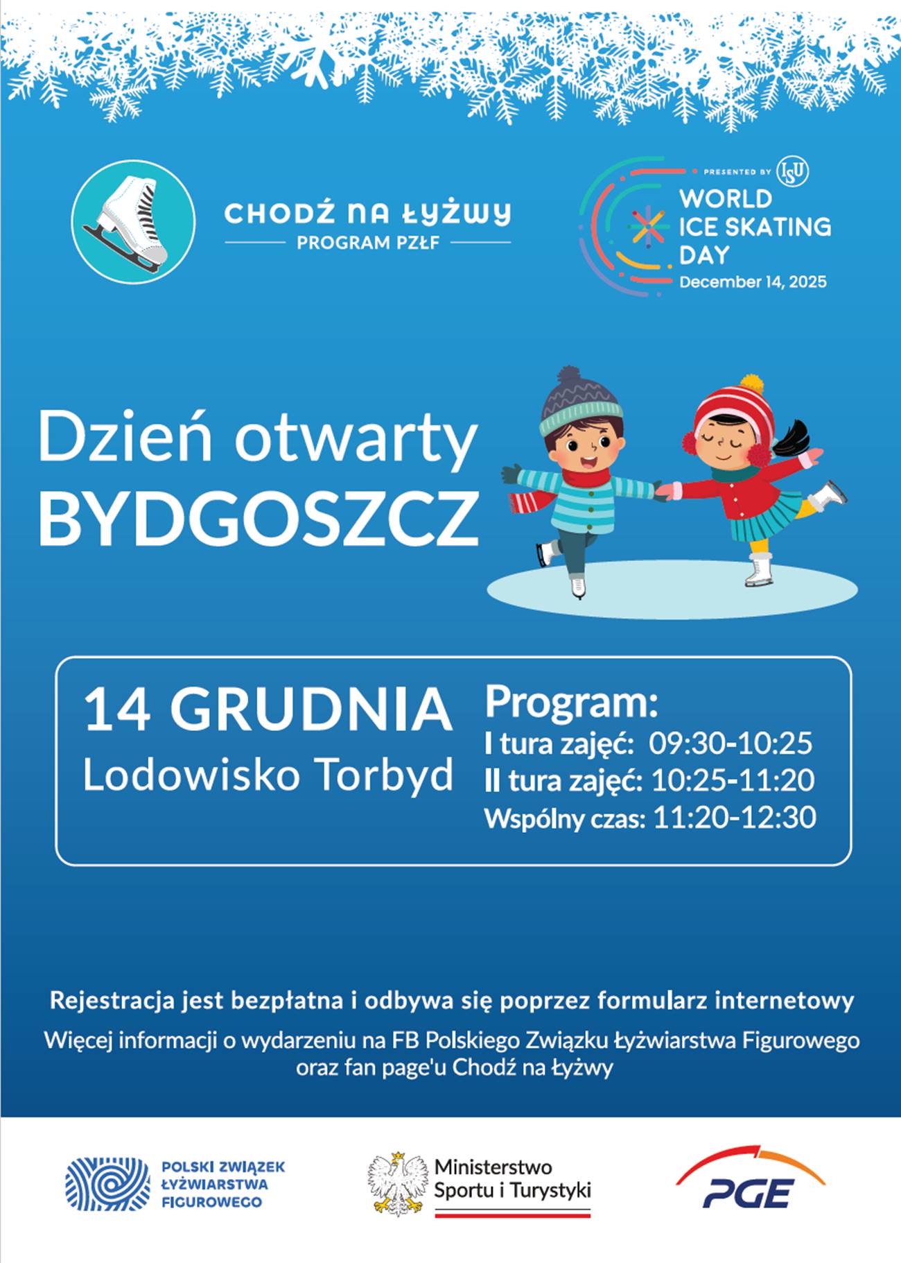 W Bydgoszczy Światowy Dzień Łyżwiarstwa upłynie w wyjątkowy sposób. Już 14.12 na Lodowisku Torbyd odbędą się bowiem dni otwarte Chodź na Łyżwy - programu spod szyldu Polskiego Związku Łyżwiarstwa Figurowego inspirującego i motywującego dzieci do aktywnego spędzania czasu na lodzie.