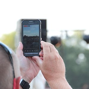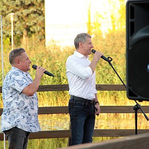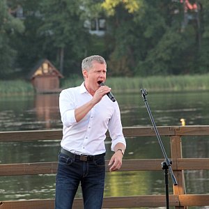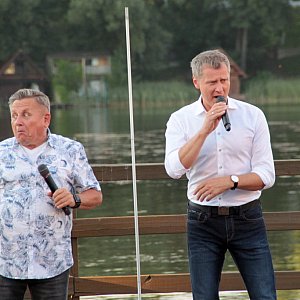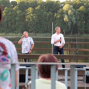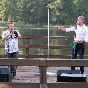 Maseczki na twarzy być może zasłaniały uśmiechy, ale bynajmniej nie tłumiły entuzjastycznych reakcji wywoływanych kolejnymi dowcipami, ani nie przeszkadzały w śpiewaniu, a okazji do wspólnego śpiewania nie brakowało. Oczywiście prym w tej kwestii wiódł czarujący publiczność Krzysztof Respondek, ale i drugi z Krzysztofów nie dawał za wygraną, wtrącając tu i ówdzie wokalne puenty. Ta osobliwa rywalizacja o względy damskiej części publiczności stała się podstawą do humorystycznego przekomarzania się naszych gości. Gdy ze sceny na moment schodził Krzysztof Respondek, jego kolega w geście szalonej autoprezentacji ze wszystkich sił podkreślał swoje walory, gdy zaś to on opuszczał amfiteatr przy sępoleńskim molo, zostawiając sam na sam z publicznością Krzysztofa Respondka, rolę się odwracały i młodszy z Krzysztofów kokietował zasiadające na widowni Panie. Koniec końców wszyscy uznali, że obaj Panowie są równie sympatyczni i nie sposób między nimi wybierać, czego najlepszym dowodem była gorąca prośba o bis. Czy artysta powracający do występów na żywo po kilkumiesięcznej przerwie może prosić o lepszy komplement?