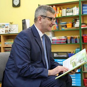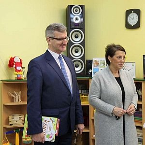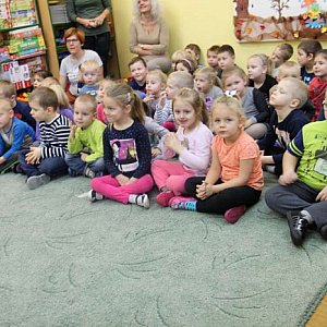 Przedszkolaki z grup „Pszczółki”, „Biedronki” i „Żuczki” z zaciekawieniem wysłuchały przygód pana Sowy, Prosiaczka, Tygryska, Kubusia i Kłapouszka. Dzieci z radością przyjęły gościa, a za pięknie przeczytaną bajkę podziękowały, wręczając panu staroście bibułkowe kwiaty, dyplom i przygotowaną własnoręcznie książeczkę z ulubionymi bajkami grupy „Żuczki”.