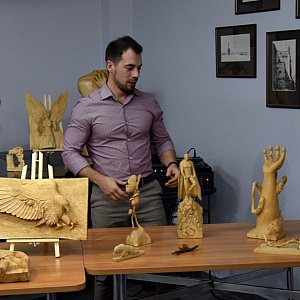 Artysta opowiadał o tym jak przez pewien zbieg okoliczności trafił do Tucholi, aż trudno uwierzyć, że mówiący doskonale po polsku rzeźbiarz nie znał przed przyjazdem ani jednego polskiego słowa. Opowiadał o swojej pasji rzeźbiarskiej, technice w jakiej z jednego kawałka drewna przy pomocy piły łańcuchowej, różnej wielkości elektrycznych szlifierek wykonuje swoje prace. Godna podziwu jest precyzja z jaką przy pomocy takich narzędzi potrafi (przypominam, z jednego kawałka drewna) wyczarować tak finezyjne „drobiazgi”. Przykładem może być rzeźba przedstawiająca przymkniętą dłoń, w której znajduje się motyl z precyzyjnie wyrzeźbionymi czułkami. Prezentacji prac towarzyszyły fotogramy przedstawiające artystę ze swoimi dziełami.