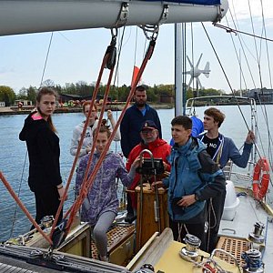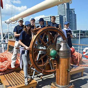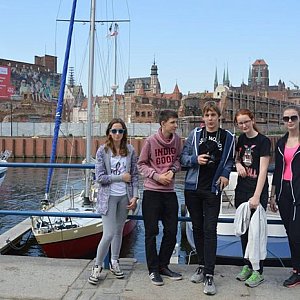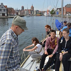Po chwili powędrowaliśmy malowniczymi uliczkami na Długi Targ, pokłonić się przed rejsem Neptunowi i na wieżę Kościoła Mariackiego podziwiać piękną panoramę Gdańska. Po powrocie, już bez zbędnej zwłoki, odbiliśmy od kei, udając się w stronę otwartego morza. W tym czasie na pokładzie trwała intensywna nauka buchtowania lin, wykonywania węzłów żeglarskich oraz terminologii żeglarskiej. Operowanie kołem sterowym jachtu sprawiało nam wielką frajdę, a wypłynięcie z portu na otwarte morze pozwoliło uwierzyć, że nasza przygoda na dobre się rozpoczęła.