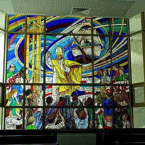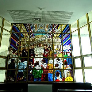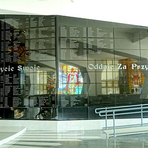 Jego rzucająca się z dala w oczy bryła trudna jest do zaliczenia do jakiegoś konkretnego stylu. Wewnątrz najbardziej przypominał mi konstrukcje z labiryntu biblioteki znanej z filmu "Imię róży". Sama nawa kościoła z ciekawym wystrojem, kaplice z wierną repliką prywatnej watykańskiej kaplicy św. Jana Pawła II, z kaplicą pamięci tych, którzy oddali życie ratując Żydów (tam bez przerwy odczytywane są ich imiona i nazwiska). Równie ciekawe jest całe otoczenie z wygrywającymi różne melodie karylionami, kaplicami różańcowymi i rzeźbami. Nie podejmę się jego opisu niech zdjęcia mówią same za siebie.