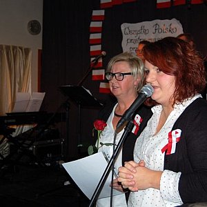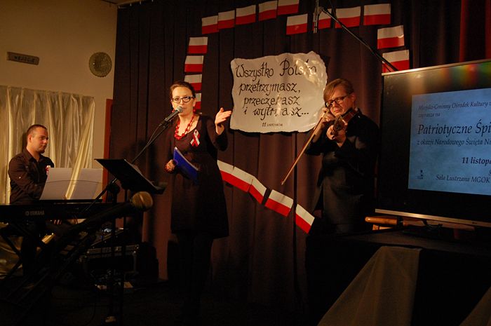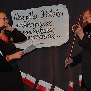 Oprawę słowną i muzyczną tej świątecznej wieczornicy przygotowali pracownicy Miejsko-Gminnego Ośrodka Kultury w Więcborku. Agata Pufal, instruktorka śpiewu, przypomniała krótko historię niektórych pieśni i świetnie wprowadzała zebranych w pierwsze takty znanych patriotycznych melodii. Gromkiemu śpiewaniu zebranych w sali lustrzanej więcborczan akompaniowali Janusz Jędrzejczyk - skrzypce oraz Sławomir Stencel - piano. Wspólny śpiew przeplatał się tego wieczoru z poezją, a najpiękniejsze wiersze polskich poetów o miłości do Ojczyzny recytowali Renata Bloch i Paweł Szydeł.