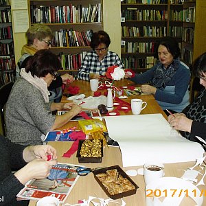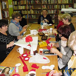 Przybyli członkowie i sympatycy sprawnie, metodą manufaktury wykonali kilkadziesiąt emblematów. Nie zabrakło, jak zwykle przy takich okazjach, wesołych rozmów, wymiany doświadczeń i radości. Wizyta w bibliotece była też okazją do wymiany książek.