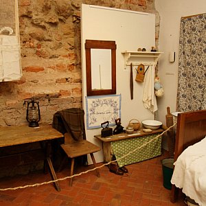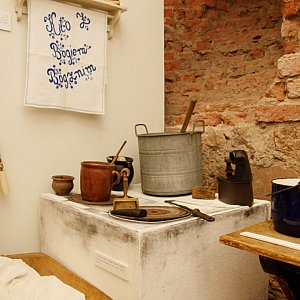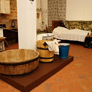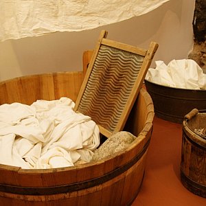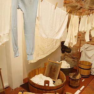 Gospodynie radziły sobie wykorzystując naturalne środki piorące począwszy od ługu poprzez korzenie mydlnicy lub tataraku, na piasku używanym do szorowania naczyń skończywszy. Na wystawie można zobaczyć także naczynia i narzędzia używane do utrzymywania czystości. Jest także dawna toaleta.