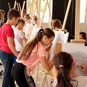Wszystkim działaniom przyświecała idea współpracy, której efektem były fantastyczne prace. Mimo, iż dzieci często pracowały w grupach, już po pierwszych dniach byliśmy w stanie odróżnić indywidualny styl każdego z nich. Dzięki temu nasza Letnia Akademia Sztuki była prawdziwie kolorowa i różnorodna. Bez wątpienia największym zainteresowaniem cieszyły się warsztaty malowania na wodzie starożytną techniką ebru. Technika przenoszenia na papier wzorów tworzonych na wodzie za pomocą specjalnych farb okazała się prawdziwie magiczna. Dzieci, ale i dorośli animatorzy kultury, nie kryli zdumienia, gdy początkowo abstrakcyjne plamy na wodzie odbijały się na kartce papieru, tworząc tym samym barwny kolaż. Dominowały motywy roślinne, pojawiały się jednak rozmaite impresje kosmiczne lub bardziej abstrakcyjne połączenia fal, wiraży i struktur geometrycznych. Sporym wyzwaniem były również zajęcia polegające na artystycznym zdobieniu mandali. W pełnym skupieniu, przy akompaniamencie nastrojowej muzyki, dzieci wypełniały kolorami drobne elementy skomplikowanych wzorów, które w rezultacie końcowym prezentowały się zjawiskowo. Duch przyjaznego współzawodnictwa towarzyszył warsztatom land-art, których celem było stworzenie wielkiej, barwnej mozaiki z kolorowych liści. Obie grupy podglądały postępy pracy kolegów i koleżanek, wracając do swoich drużyn z nowymi pomysłami. Ostatecznie wszyscy zgodnie przyznaliśmy, że efekt przerósł nasze najśmielsze oczekiwania.