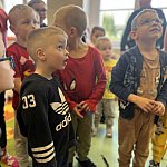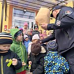 Następnie przewodnik psa służbowego opowiedział o swojej codziennej pracy oraz o zadaniach, jakie wykonują policyjne psy. Największe zainteresowanie wzbudził oczywiście Kofi- pies służbowy, który szybko zdobył sympatię najmłodszych. Policjant zaprezentował również krótki pokaz posłuszeństwa psa. Z zachowaniem wszelkich środków bezpieczeństwa Kofi reagował na polecenia swojego przewodnika, prezentując podstawowe komendy i elementy szkolenia. Ten mini pokaz wzbudził wśród dzieci ogromne zainteresowanie i został nagrodzony gromkimi brawami.