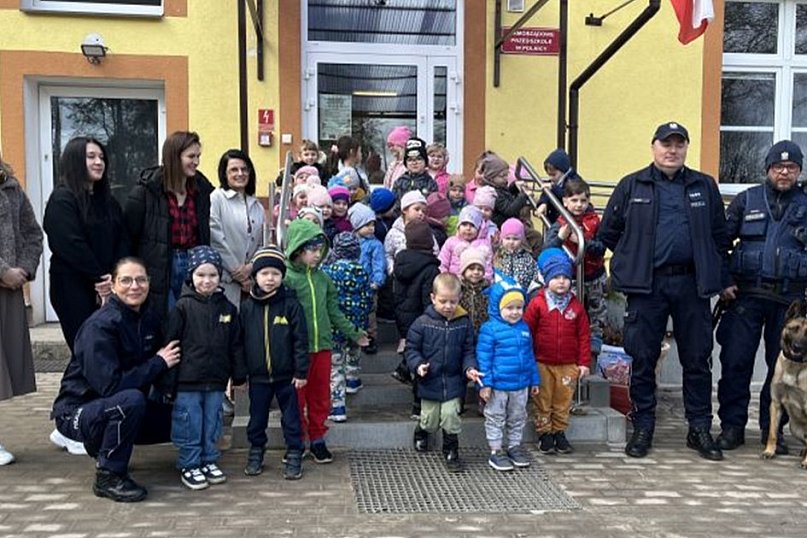 Po części teoretycznej wszyscy przenieśli się na zewnątrz budynku przedszkola, gdzie policjanci zaprezentowali radiowóz przystosowany do przewożenia psa służbowego. Dzieci mogły zobaczyć specjalne miejsce dla czworonożnego funkcjonariusza oraz usłyszeć policyjne sygnały dźwiękowe, co wywołało wiele radości i emocji.