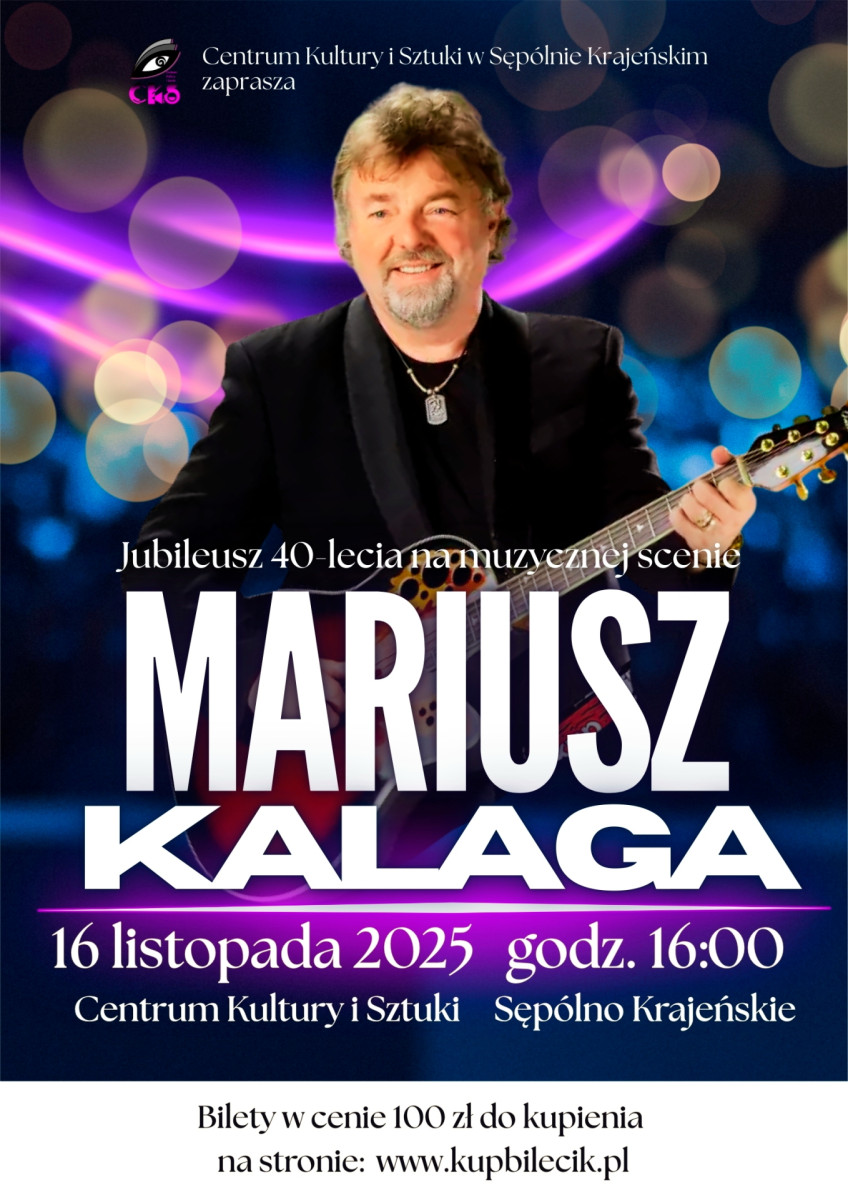 16 listopada 2025r o godz. 16:00 w Centrum Kultury i Sztuki w Sępólnie Krajeńskim, wystąpi Mariusz Kalaga-wokalista, gitarzysta i autor od lat cieszący się ogromną sympatią publiczności. Artysta, nazywany "Royem Orbisonem znad Wisły "od lat łączy w swojej twórczości brzmienia muzyki pop, country folk i biesiadnej. Podczas koncertu usłyszymy takie przeboje jak "Jedna z gwiazd", "Szukaj mnie", czy "Co tu jest grane". Niezmiennie towarzyszy mu ogromna charyzma, poczucie humoru i świetny kontakt z widownią, które sprawiają, że każdy występ zamienia się w radosne muzyczne spotkanie.