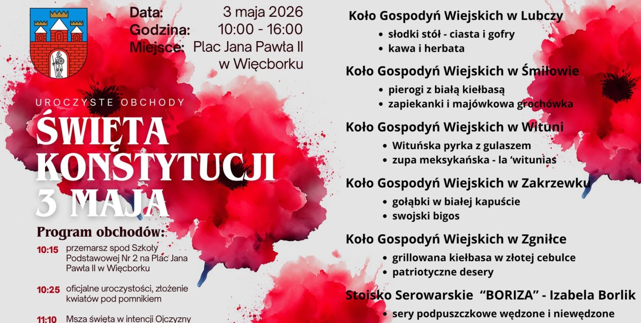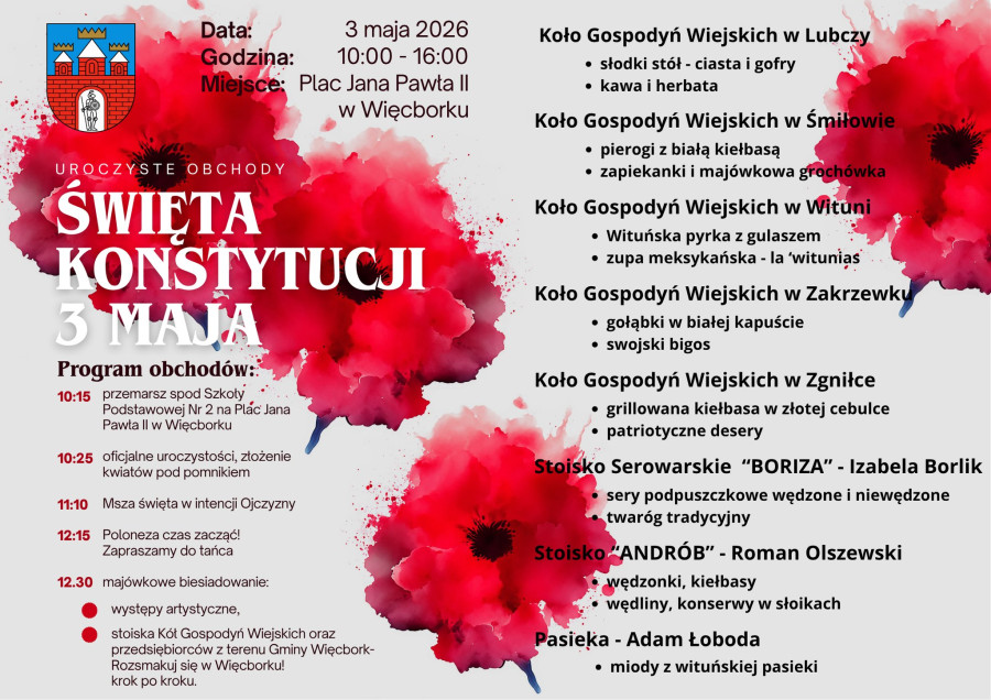 Święto Narodowe 3 Maja to wyjątkowy dzień, który w Więcborku chcemy uczcić wspólnie z mieszkańcami i wszystkimi gośćmi naszej gminy. Zapraszamy na majówkę pełną smaków, tradycji i dobrej atmosfery na Placu Jana Pawła II w Więcborku.