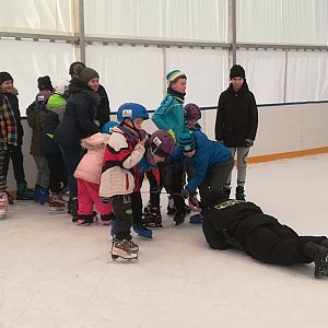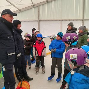 Dobry przykład bezpiecznej zabawy dał dzielnicowy sierż. szt. Paweł Kierzkowski wraz z maskotką policyjną "Polfinkiem", "szusując" z dzieciakami na łyżwach. Polfinek dał również kilka rad dotyczących kulturalnej jazdy na lodowisku, co jest ważne dla zachowania bezpieczeństwa w szczególności tych najmłodszych, którzy dopiero się uczą jeździć.
