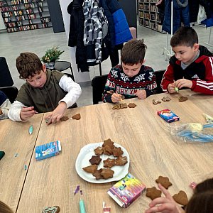 Wtorek upłynął pod znakiem dziecięcej energii i wyobraźni. Mali artyści z wielkim zaangażowaniem przygotowywali swoje ozdoby, ale największe emocje wzbudziła dodatkowa atrakcja: zdobienie pierników. Kolorowe lukry, posypki i zapach przypraw korzennych sprawiły, że w bibliotece poczuliśmy prawdziwy przedsmak Wigilii.
