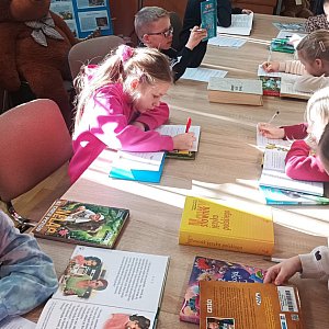 Wtorkowe zajęcia porwały wszystkich w świat książek. W gęstwinie regałów bibliotecznych dzieciaki szukały tytułów, które ułatwią im rozwiązanie bibliotecznych zadań. W wielkim skupieniu niczym „Mole Książkowe”, każdy pochylał się nad książką by wykonać swoje zadanie. Dzięki ścisłej współpracy wszyscy celująco poradzili sobie z tym zadaniem. Przy okazji dzieciaki poznały budowę książki oraz  odszukały w słownikach znaczenie słowa ekslibris. Biblioteczną przygodę zakończyło rozwiązywanie krzyżówek.