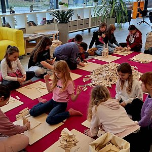 W bibliotece odbywały się również zajęcia kreatywne. Dzieci układały konstrukcje z 10 tysięcy drewnianych klocków, rozwijając wyobraźnię przestrzenną i umiejętność współpracy. Nie zabrakło także spotkania z literaturą. Przygody kota Cukierka zainspirowały uczestników zajęć do warsztatów plastycznych, wykonali oni kolorowe kocie maski, wykazując się pomysłowością i artystycznym talentem.