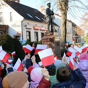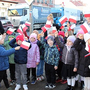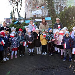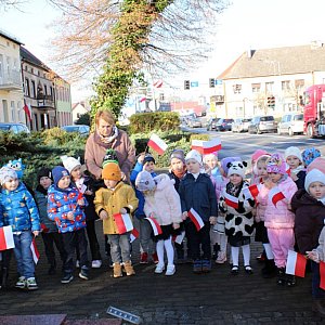 Delegacja dzieci wraz z panią dyrektor zapaliła znicz pod pomnikiem, oddając hołd bohaterom walczącym o wolność naszej ojczyzny. Następnie maluchy z dumą odśpiewały „Mazurek Dąbrowskiego”. W wykonanie hymnu włożyły całe swoje serce i entuzjazm.