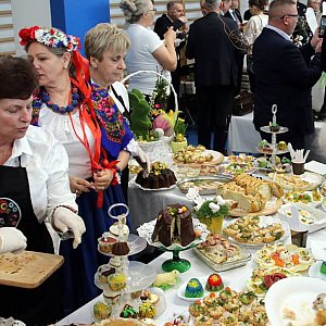 Starosta Sępoleński Jarosław Tadych i gospodarz tegorocznej wystawy Burmistrz Więcborka Waldemar Kuszewski złożyli zebranym życzenia świąteczne oraz, tradycyjnie wraz z pozostałymi włodarzami gmin, obdarowali upominkami panie z Kół Gospodyń Wiejskich, przedstawicieli Domów Pomocy Społecznej i przedstawicieli szkół, w podziękowaniu za przygotowanie wielkanocnych potraw na sobotnią wystawę. Proboszcz więcborskiej parafii ksiądz Adam Andrzejczak również złożył obecnym najserdeczniejsze życzenia z okazji zbliżającego się Święta Zmartwychwstania Pańskiego, a następnie pobłogosławił i poświęcił przygotowane na wystawę wielkanocne potrawy.