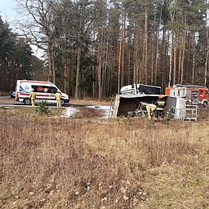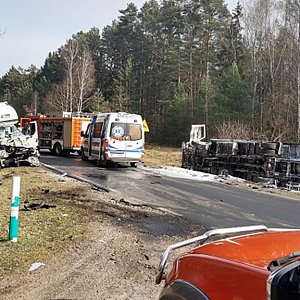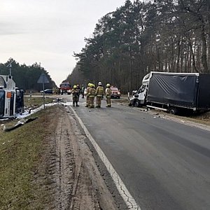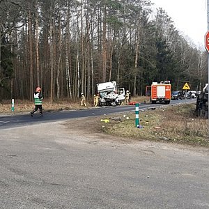 Na miejsce zdarzenia zadysponowano niezwłocznie zastępy z jednostki ratowniczo-gaśniczej wraz z grupą operacyjną a także najbliższe jednostki ochotniczych straży pożarnych. Po dojeździe potwierdzono zderzenie samochodu dostawczego z innym samochodem ciężarowym, przewożącym dodatkowo ładunek ponad 90-ciu butli stalowych z gazami technicznymi. Pojazd znajdował się w pozycji na boku a ładunek bezpośrednio w przydrożnym rowie.