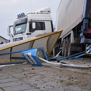 Śliski poranek na drogach. TIR dosłownie zmiótł przystanek autobusowy