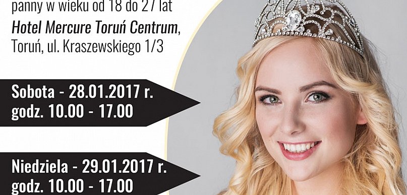 Zapraszamy do udziału w kolejnej edycji Miss Regionu Kujawsko-Pomorskiego 2017. Casting dla całego województwa odbędzie się w Toruniu w Hotelu Mercure, w dniach 28-29.01.2017 r., godz. 10-17. Będą to jedyne castingi do konkursu.