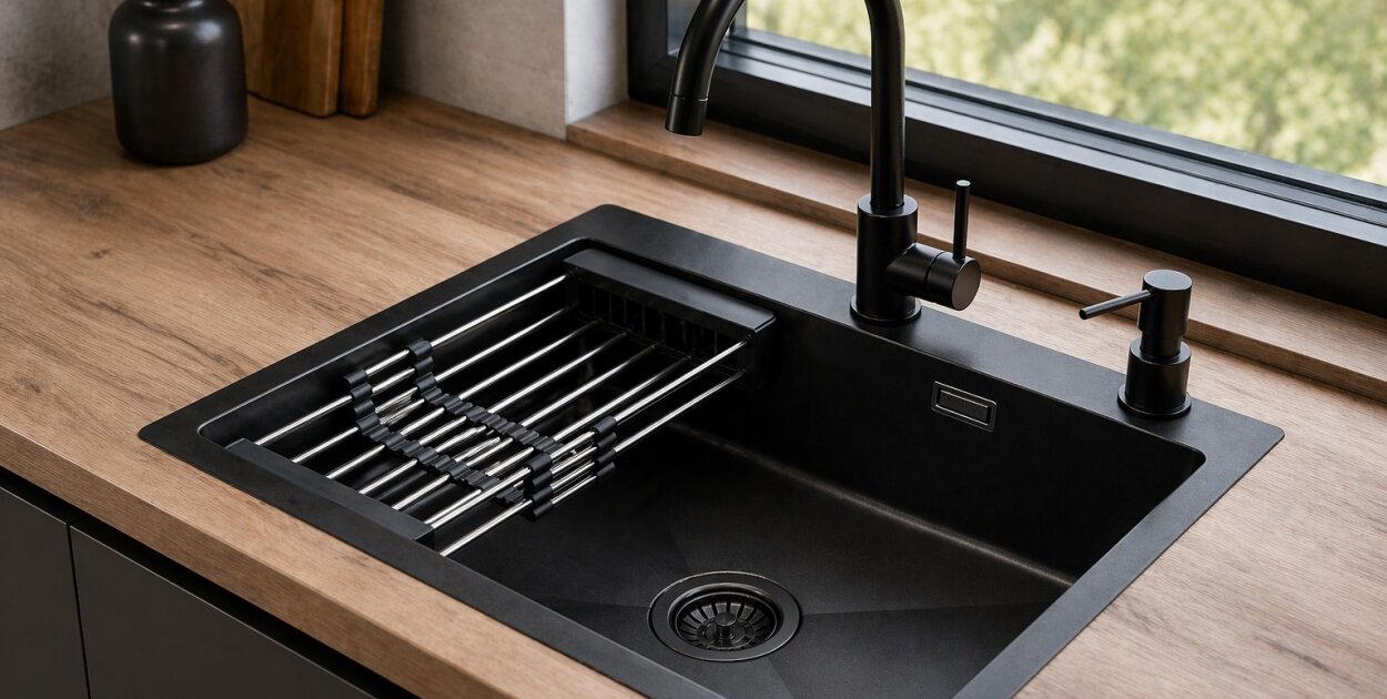 Czarny zlewozmywak często jest grafitowy, antracytowy lub matowy.