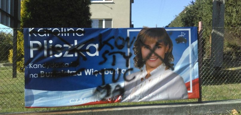 W nocy, z soboty na niedzielę, na materiałach wyborczych kandydatki na Burmistrza Więcborka wywieszonych przy ulicy Wyzwolenia w Więcborku, ktoś czarną farbą napisał hasło "Konstytucja" oraz zamalował pozostałe elementy banerów. Akt wandalizmu został zgłoszony do organów ścigania. Przypominamy, że w czasie trwania kampanii wyborczej wszelkie materiały wyborcze podlegają szczególnej ochronie prawnej.