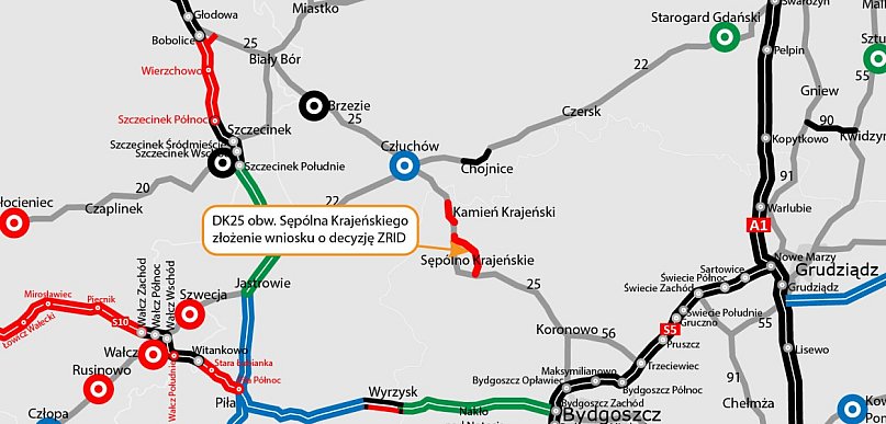 Do Wojewody Kujawsko-Pomorskiego złożyliśmy wniosek o wydanie decyzji o zezwoleniu na realizację inwestycji drogowej (ZRID) dla obwodnicy Sępólna Krajeńskiego w ciągu DK-25. Przy pomyślnym przebiegu procedur administracyjnych, decyzję powinniśmy otrzymać w IV kwartale br. - informuje Generalna Dyrekcja Dróg Krajowych i Autostrad.